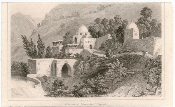 Stampa antica Old print Libia convento di Derviches a Tripoli Lemaitre 1841