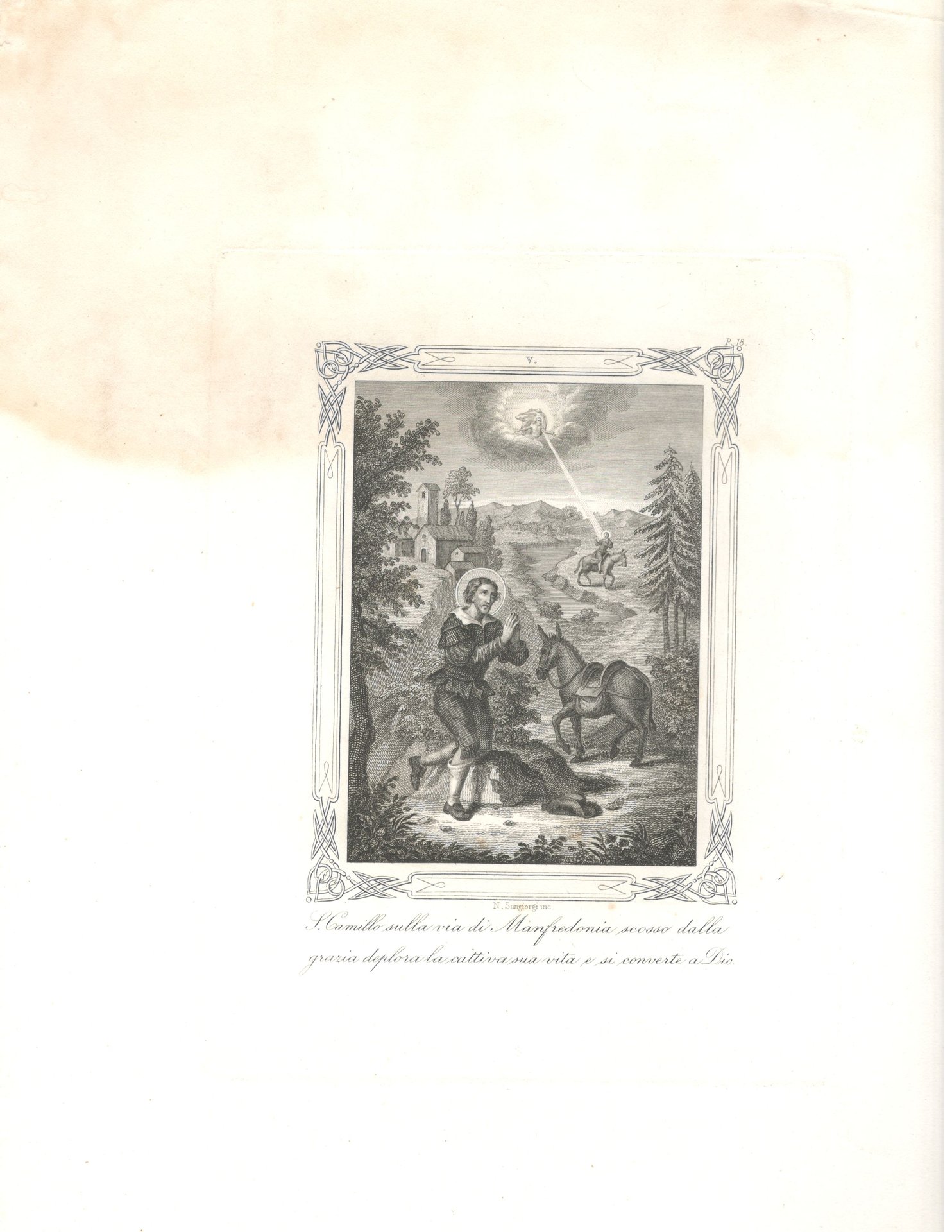 Stampa antica old print S. Camillo . si converte a Dio N. Sangiorgi inc. XIX sec.