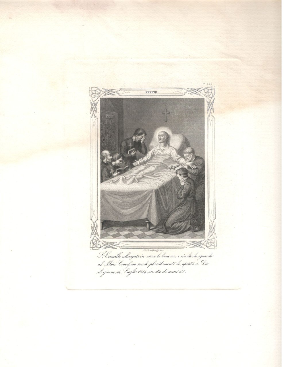 Stampa antica S. Camillo sul letto di morte 14 luglio 1614 N. Sangiorgi inc.1850 c.a.