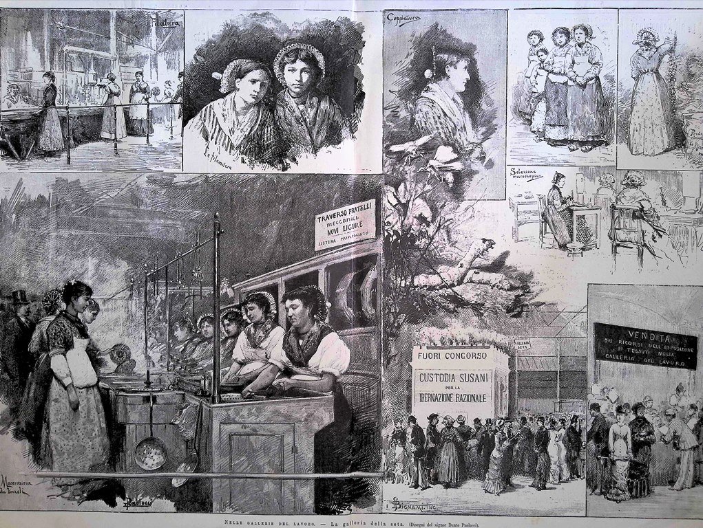 Stampa del 1881 Esposizione Milano Gallerie Lavoro Seta Dante Paolocci