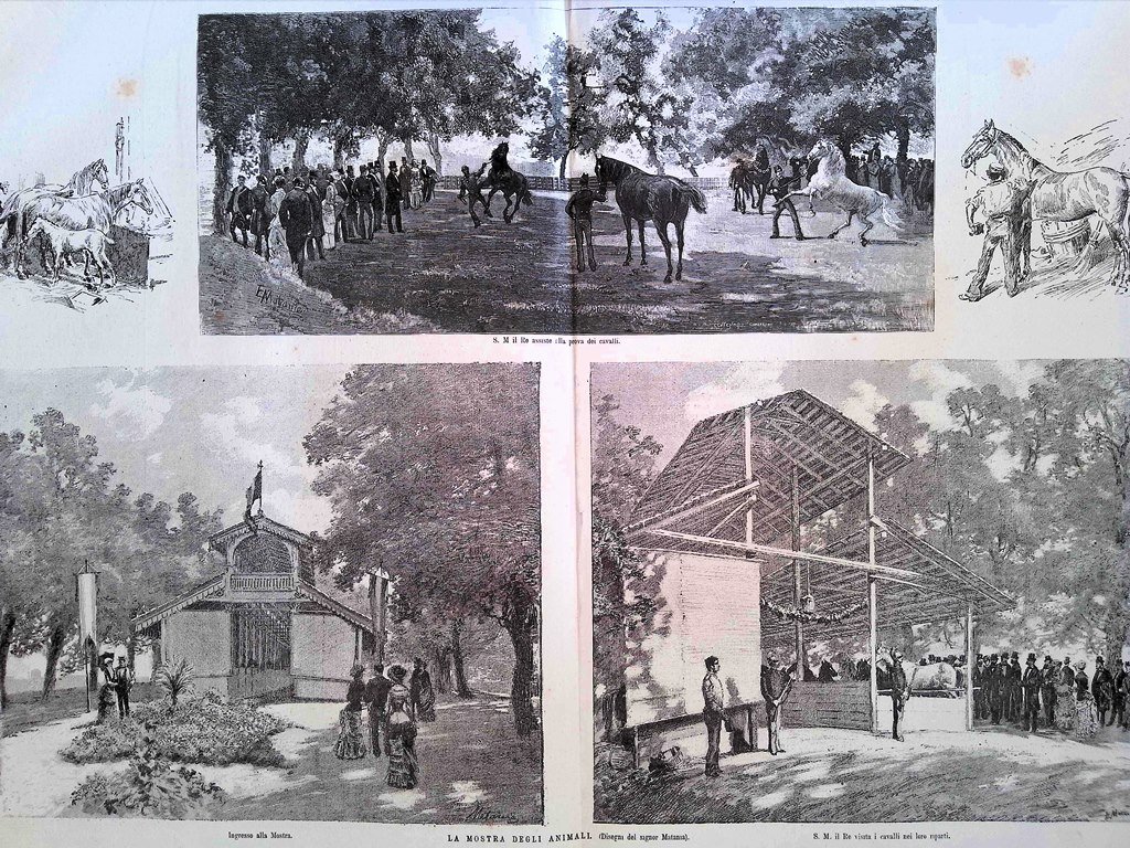 Stampa del 1881 La Mostra degli Animali Visita del Re Matania Cavalli