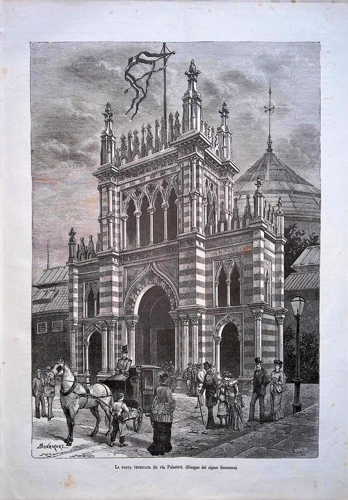Stampa del 1881 La Porta Veneziana in Via Palestro Milano Bonamore