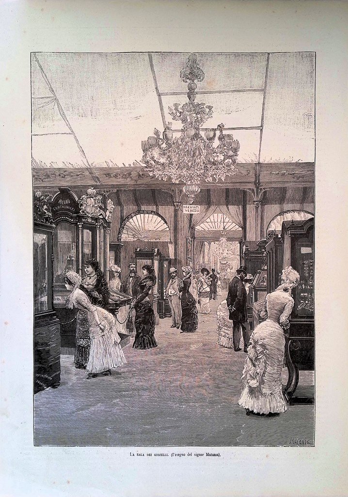 Stampa del 1881 La Sala dei Gioielli Matania Esposizione Milano