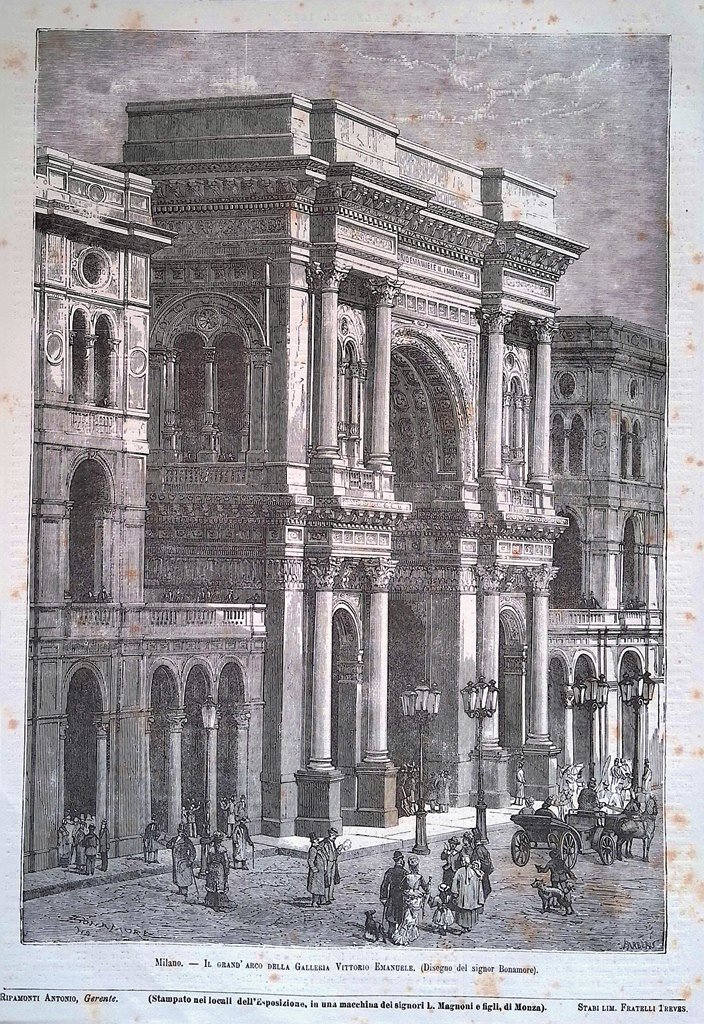 Stampa del 1881 Milano Grande Arco Galleria Vittorio Emanuele Bonamore