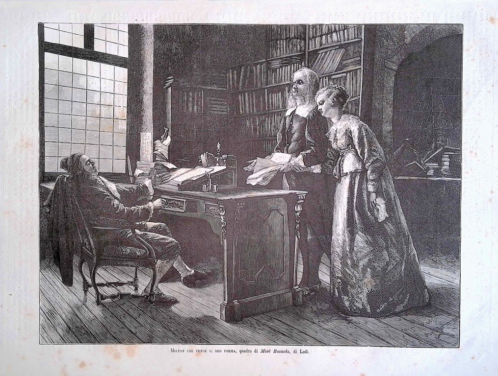 Stampa del 1881 Milton che Vende il suo Poema Mosè Bianchi Lodi Esposizione