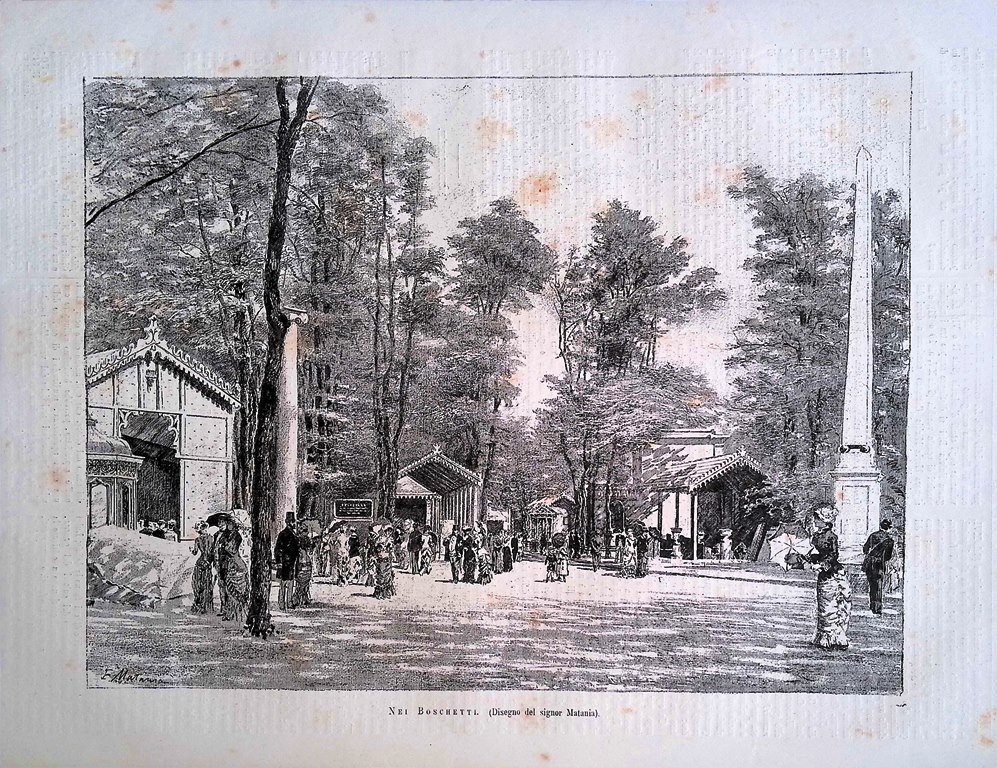 Stampa del 1881 Nei Boschetti Matania Esposizione Milano