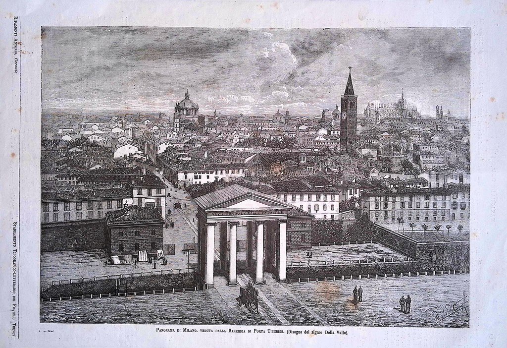 Stampa del 1881 Panorama di Milano Barriera Porta Ticinese Della Valle