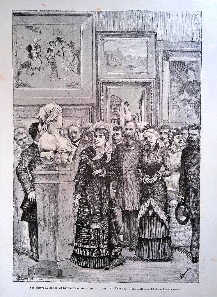 Stampa del 1881 Regina Margherita Esposizione di Belle Arti Petroliera Ginotti
