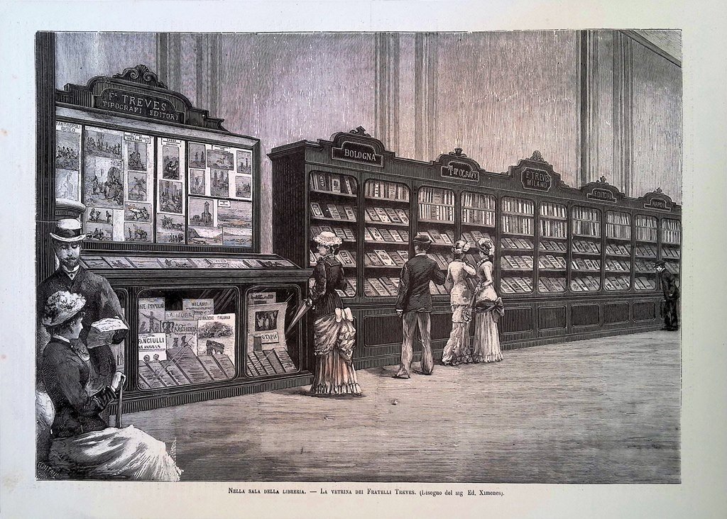 Nella sala della libreria - la vetrina dei fratelli Treves (disegno di Ed. Ximenes)