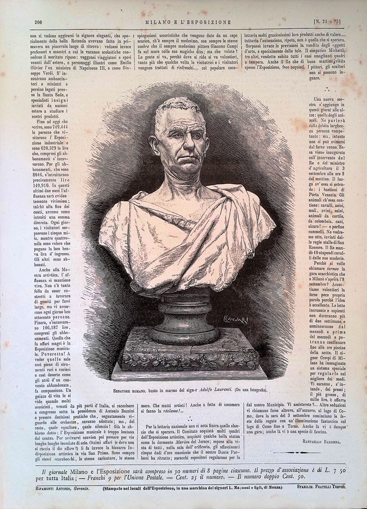 Stampa del 1881 Senatore Romano busto Adolfo Laurenti Esposizione Milano