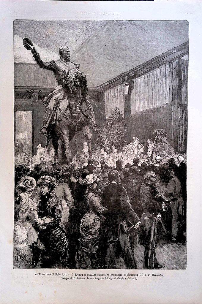 Esposizione di Belle Arti - i Sovrani si fermano davanti al monumento di Napoleone III, di F. Barzaghi (disegno di Dante Paolocci)