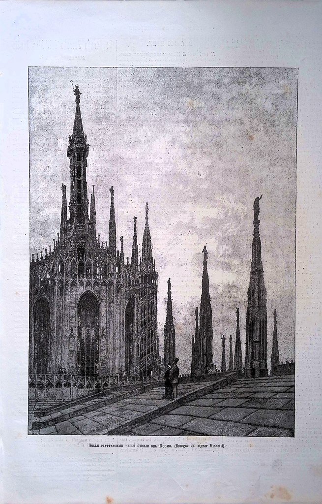 Stampa del 1881 Sulle Piattaforme delle Guglie del Duomo Milano Michetti
