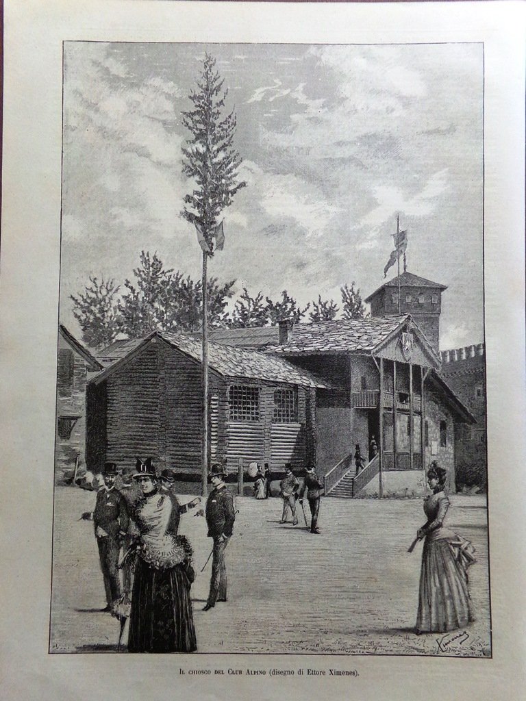 Stampa del 1884 Il Chiosco del Club Alpino Esposizione Torino Ximenes