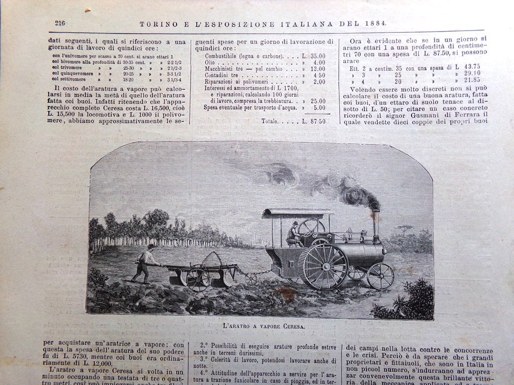 Stampa del 1884 L'aratro a vapore Ceresa