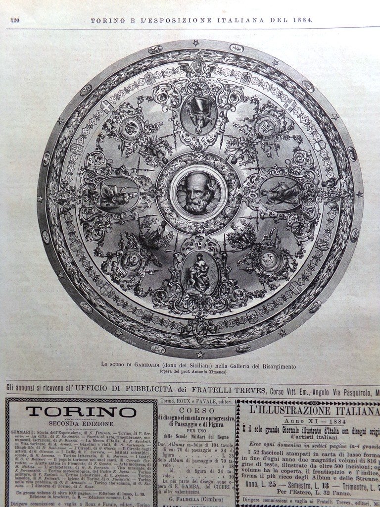 Stampa del 1884 Lo scudo di Garibaldi Dono dei Siciliani Antonio Ximenes