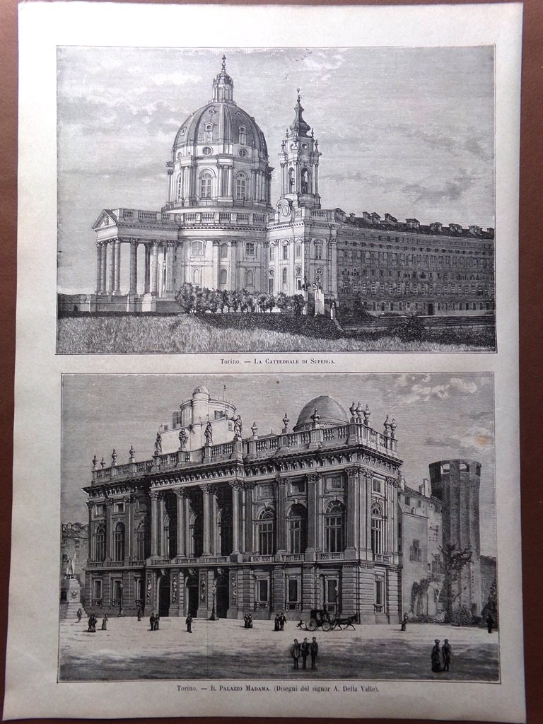Stampa del 1884 Torino Cattedrale di Superga e Palazzo Madama