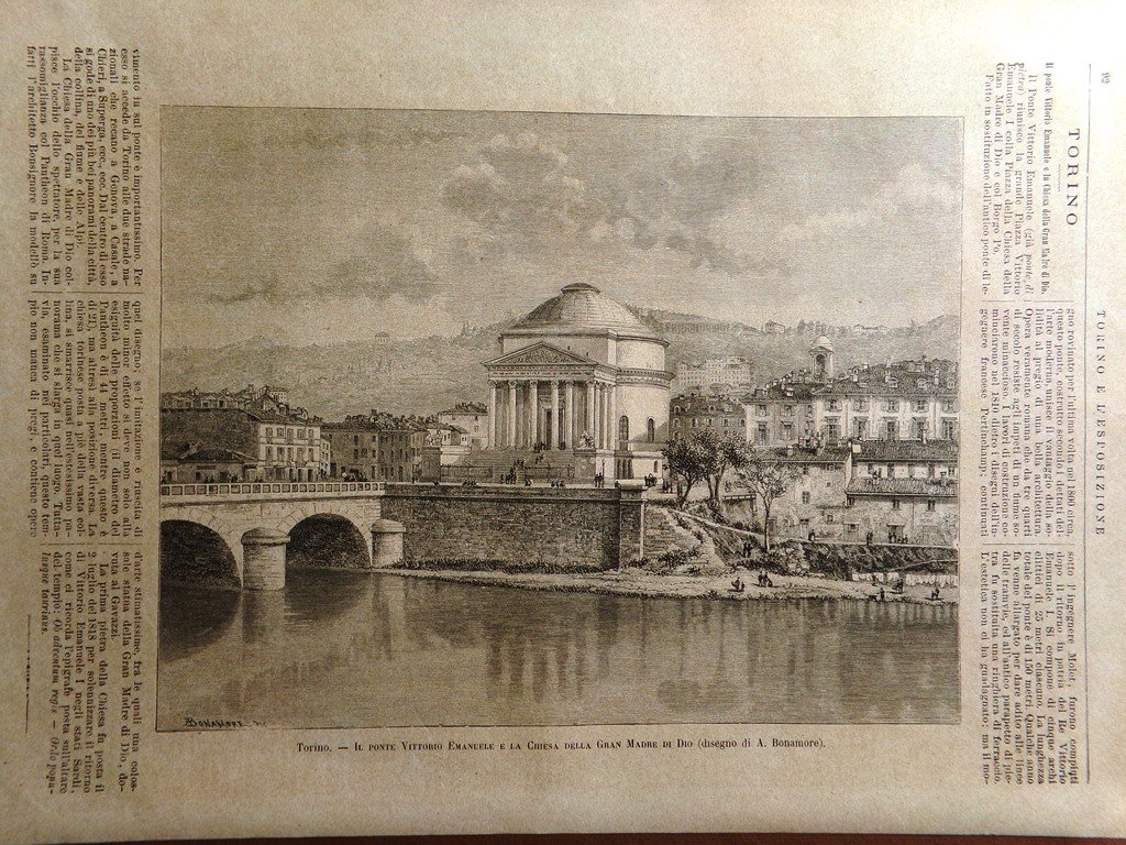 Stampa del 1884 Torino Ponte Vittorio Emanuele Chiesa Gran Madre di Dio