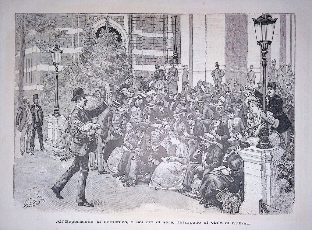 Stampa del 1889 All'Esposizione la Domenica Dirimpetto al Viale di Suffren