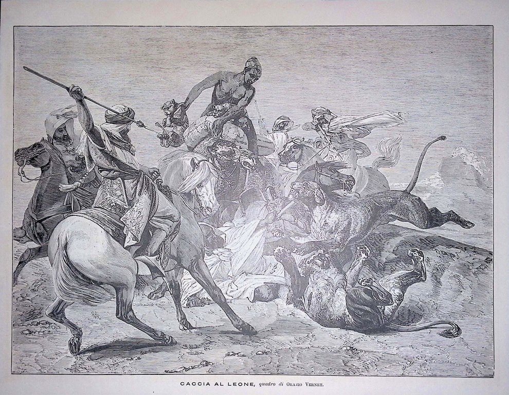 Stampa del 1889 Caccia al Leone quadro di Orazio Vernet Esposizione Parigi