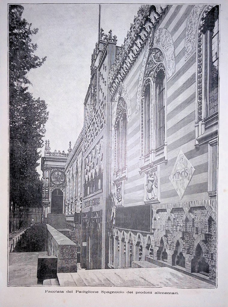 Stampa del 1889 Facciata del Padiglione Spagnolo dei prodotti Alimentari