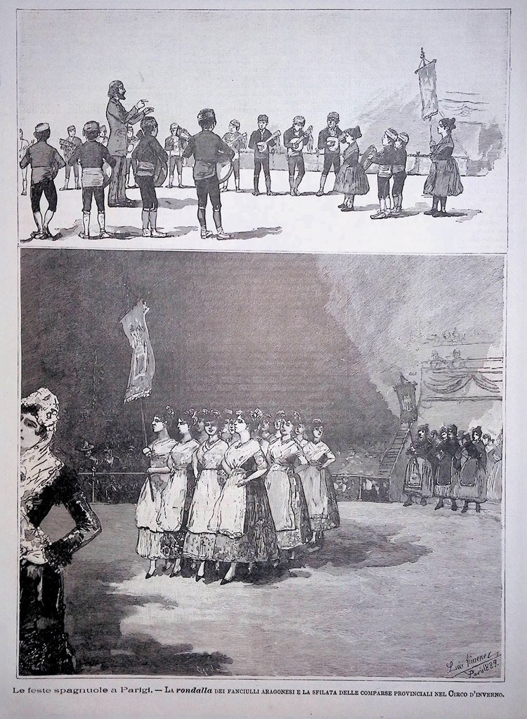 Stampa del 1889 Feste Spagnole a Parigi Rondalla Fanciulli Aragonesi Circo