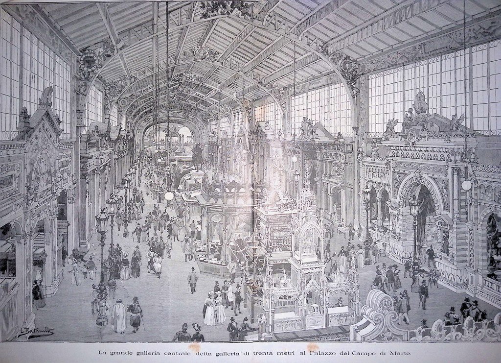 Stampa del 1889 La grande galleria centrale al Palazzo del Campo di Marte