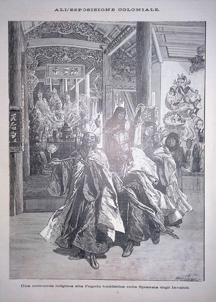 Stampa del 1889 Una cerimonia religiosa alla Pagoda Buddista Spianata Invalidi
