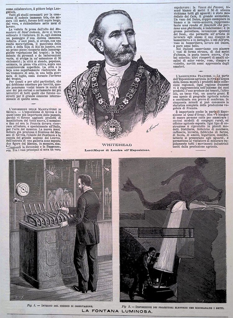 La fontana luminosa, l'interno del chiosco di osservazione, disposizione dei proiettori elettrici