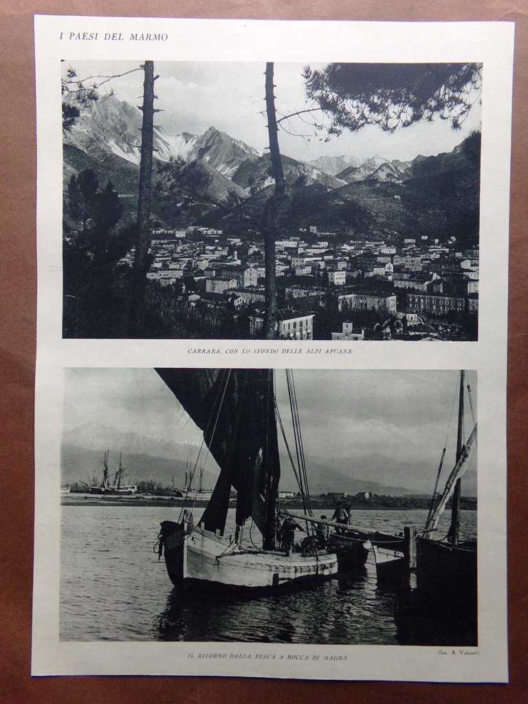 Stampa del 1927 Paesi Marmo Carrara Ritorno Pesca Bocca di Magra Marina Pineta