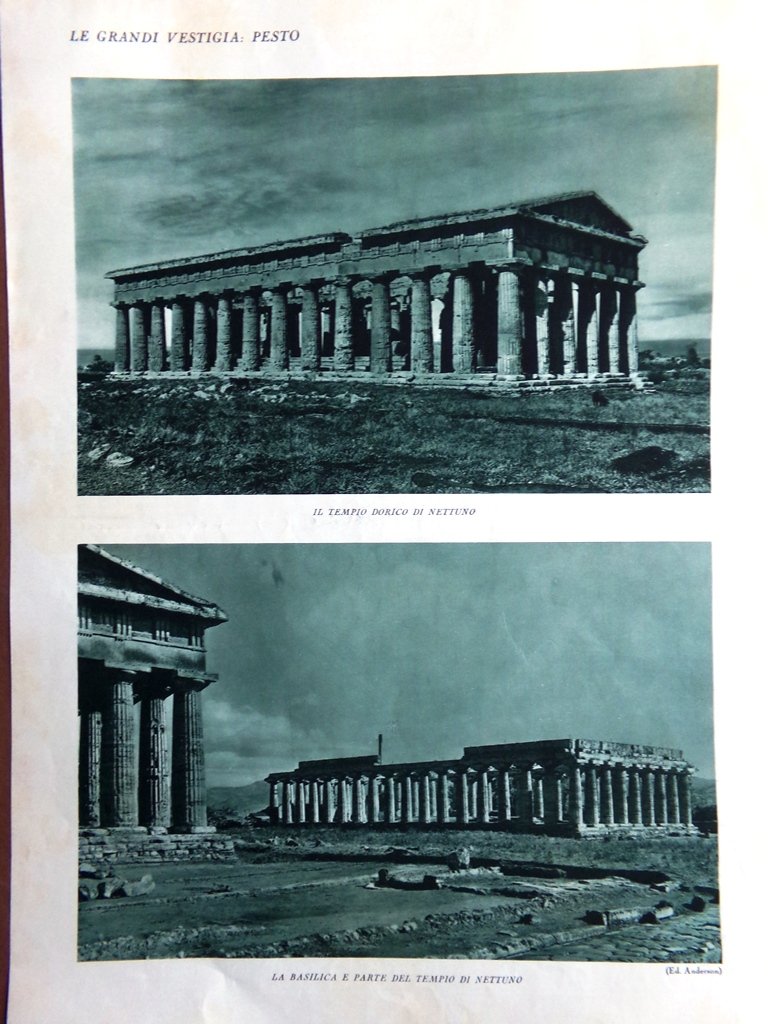 Stampa del 1927 Panorama Salerno Vestigia Pesto Tempio Dorico di Nettuno
