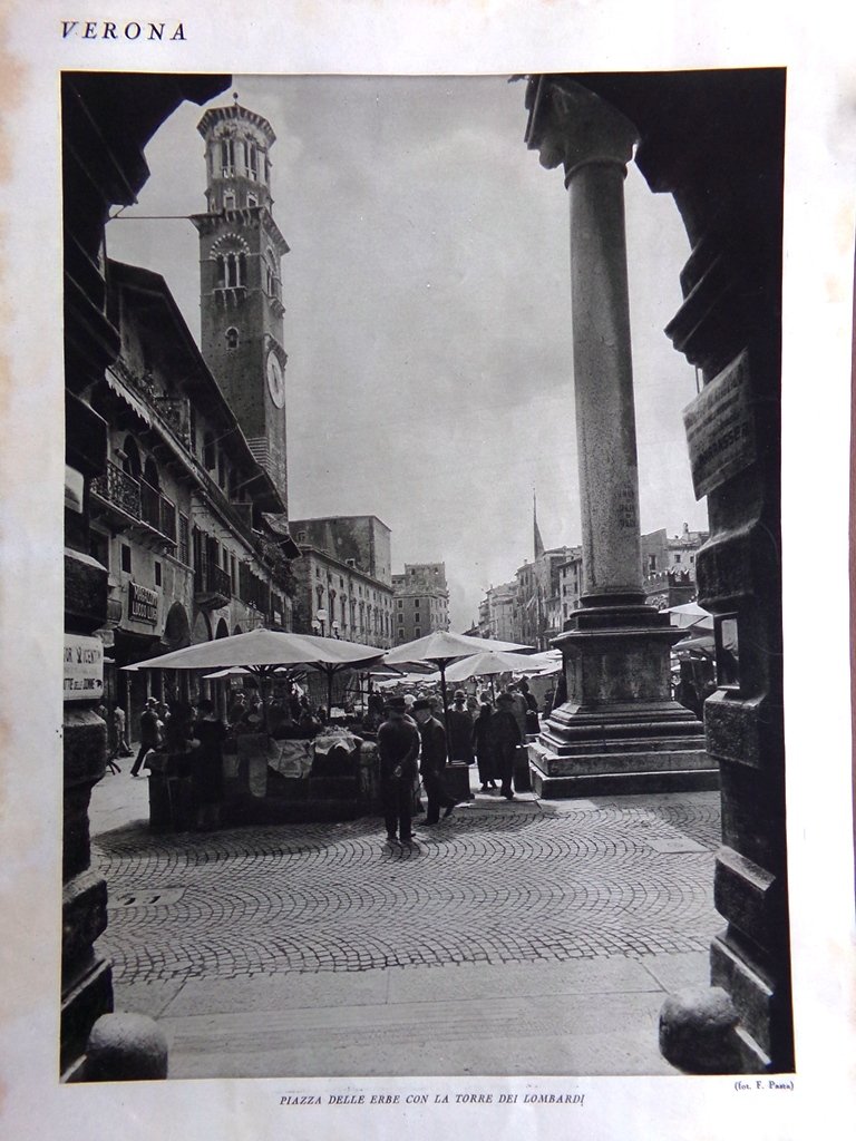 Stampa del 1927 Verona Arena Via Mazzini Piazza Erbe Torre Lombardi