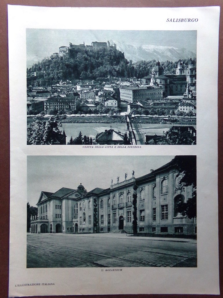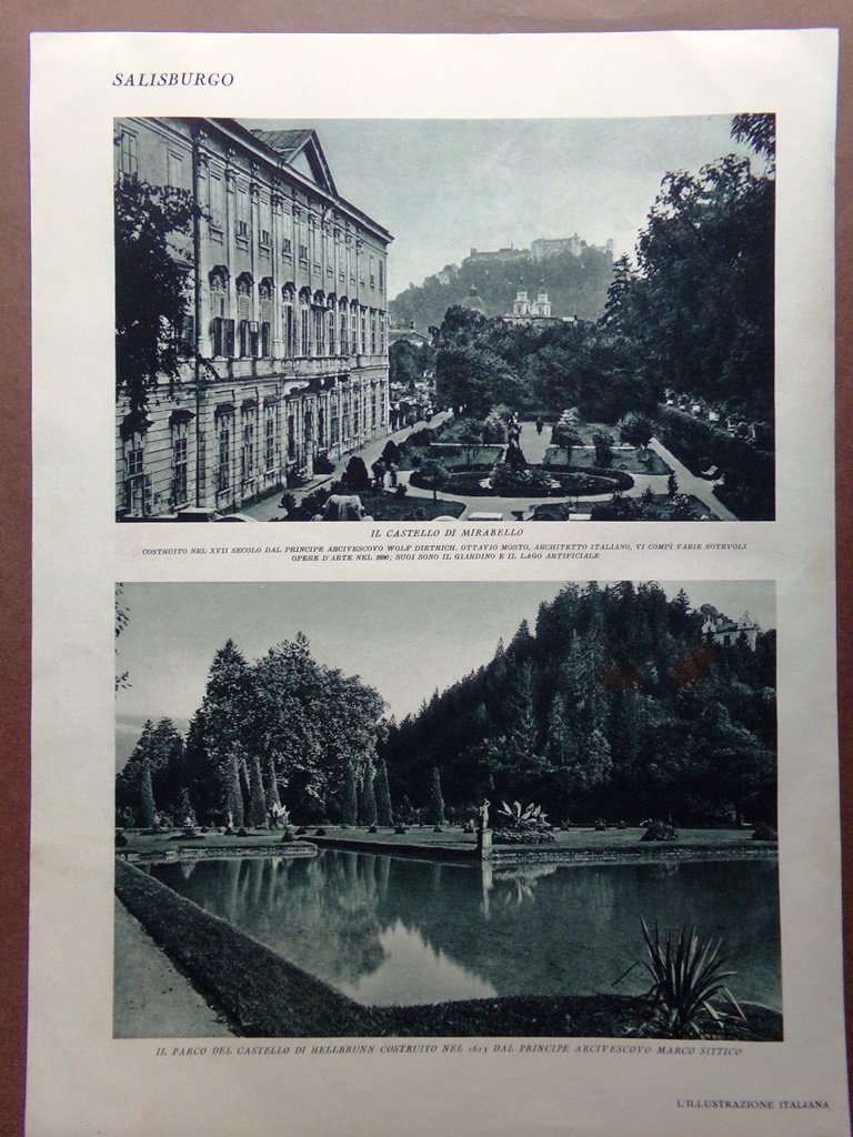 Stampa del 1929 Salisburgo Città Fortezza Mozarteum Castello Mirabello Hellbrunn
