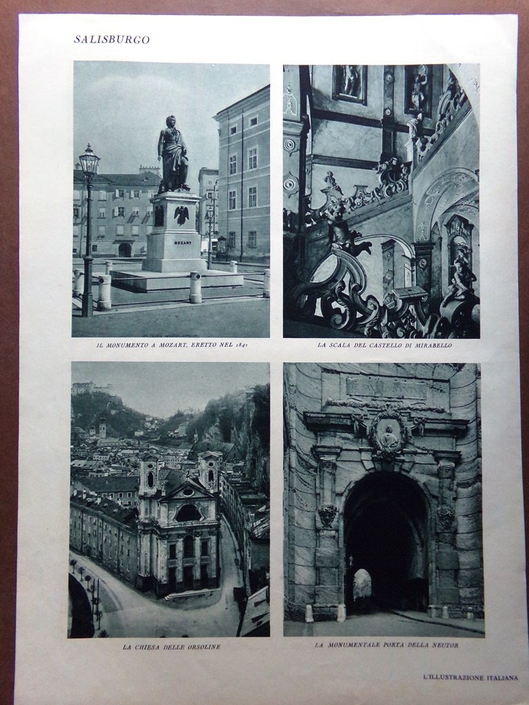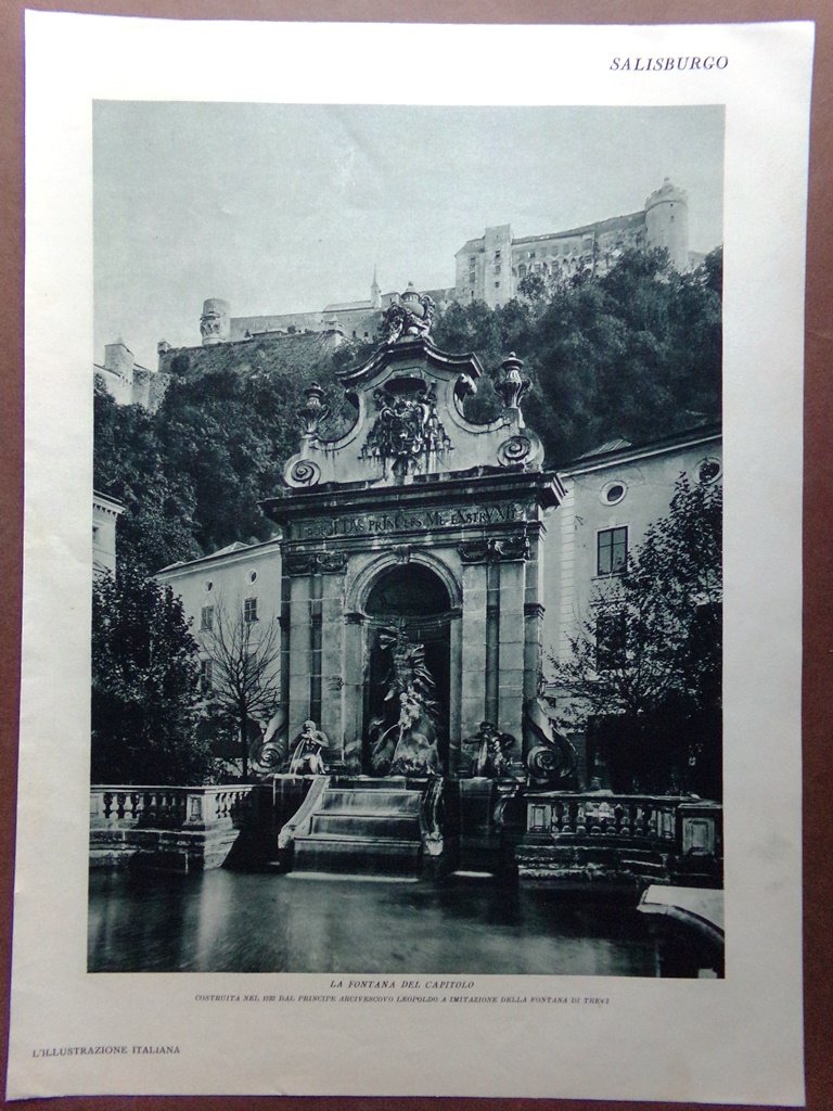 Stampa del 1929 Salisburgo Fontana Capitolo Monumento Mozart Mirabello Orsoline