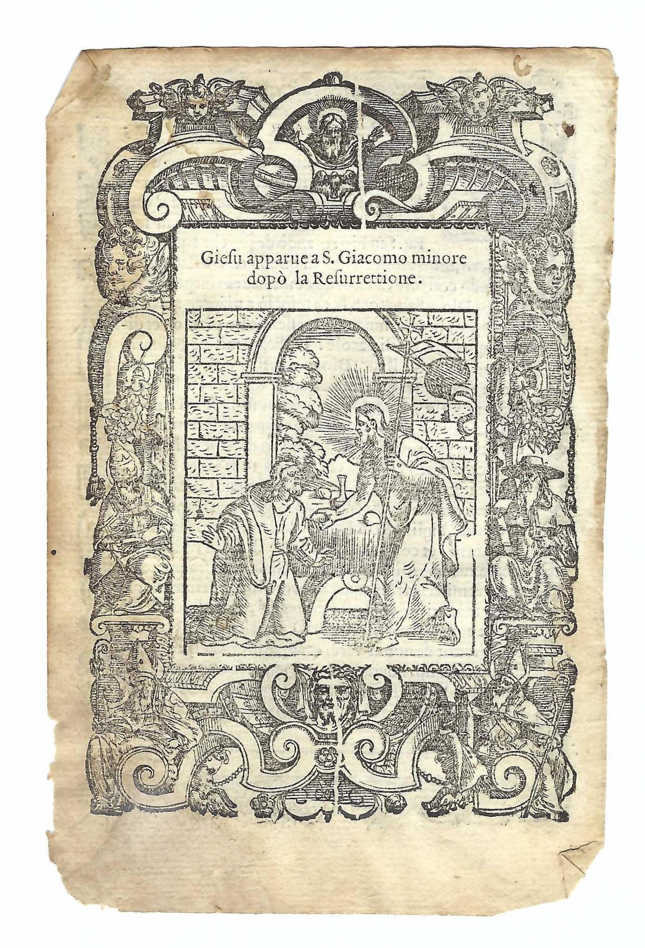 Xilografia cm. 15,7 x 10,5 il foglio, cm 13,7 x 9,4 parte incisa, bruniture ai margini, lievi mancanze al margine inferiore sinistro, margine inferiore esterno brunito e assottigliato
