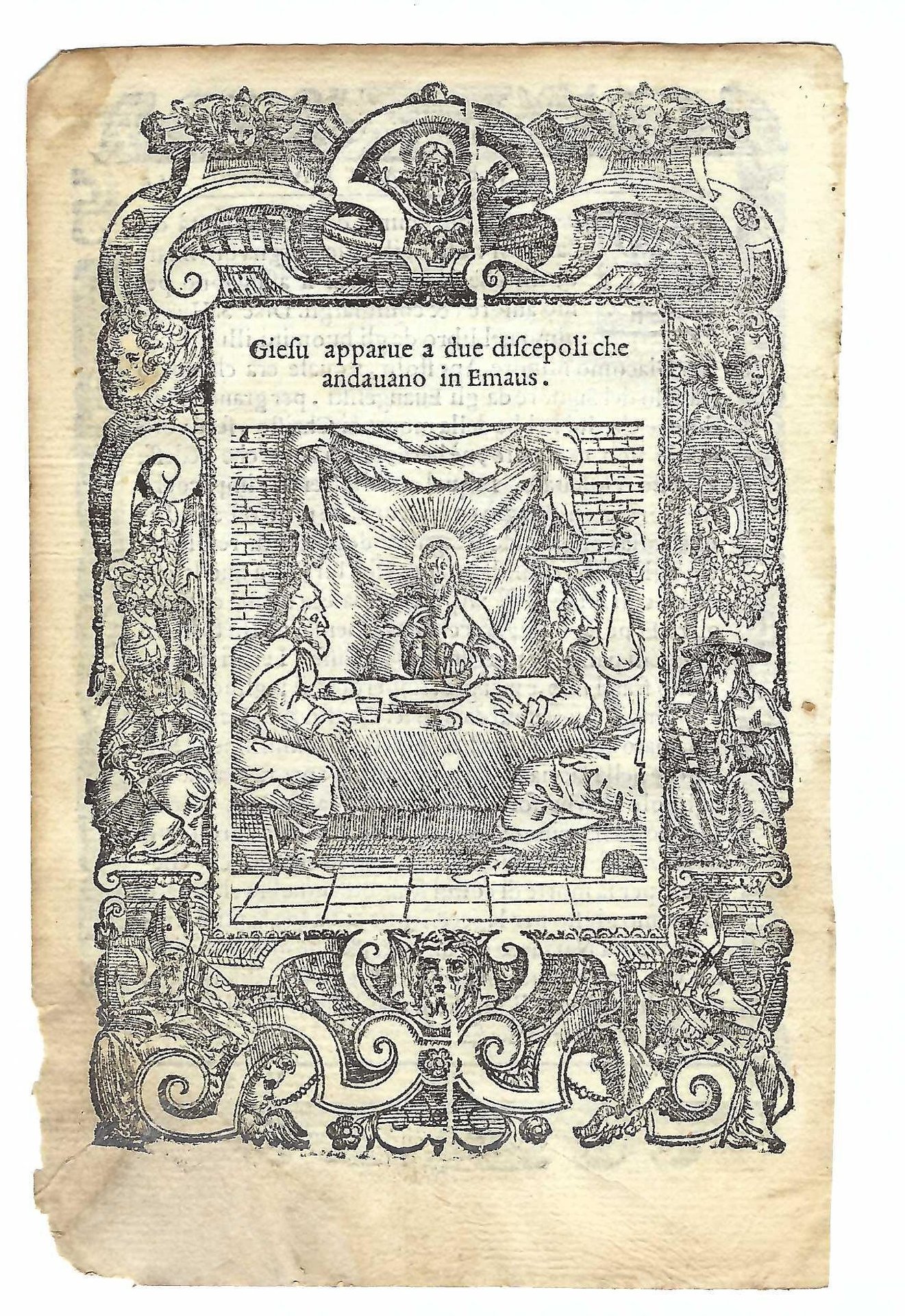 Xilografia cm. 15,7 x 10,5 il foglio, cm 13,7 x 9,4 parte incisa, bruniture ai margini, lievi mancanze al margine inferiore sinistro, margine inferiore esterno brunito e assottigliato