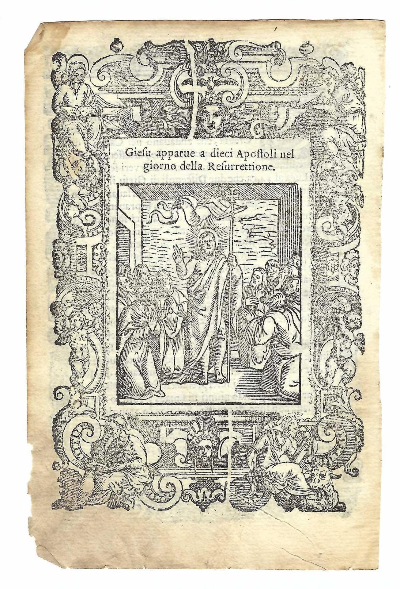 Xilografia cm. 15,7 x 10,5 il foglio, cm 13,7 x 9,4 parte incisa, bruniture ai margini, lievi mancanze al margine inferiore sinistro, margine inferiore esterno brunito e assottigliato
