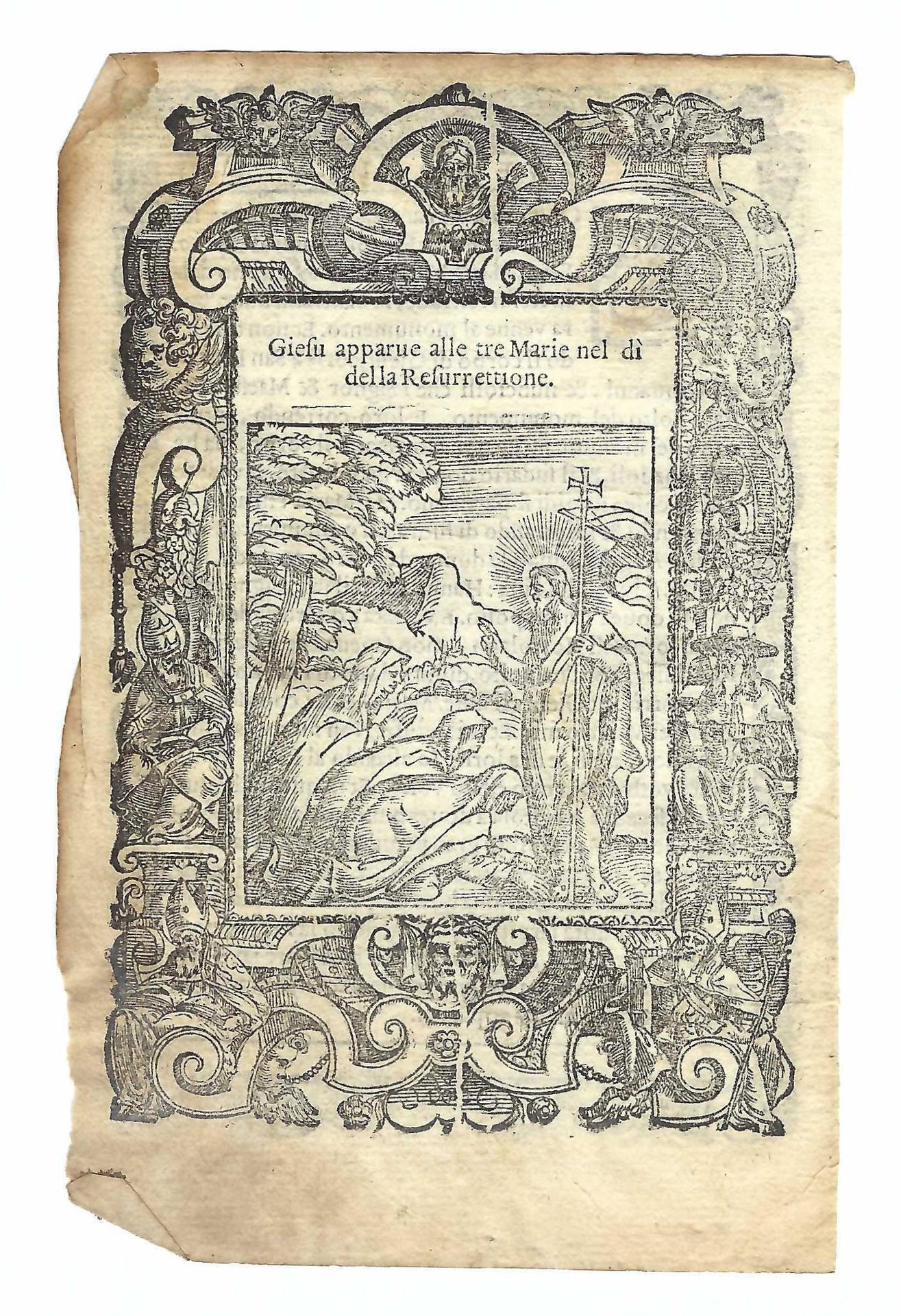Xilografia cm. 15,7 x 10,5 il foglio, cm 13,7 x 9,4 parte incisa, bruniture ai margini, lievi mancanze al margine inferiore sinistro, margine inferiore esterno brunito e assottigliato