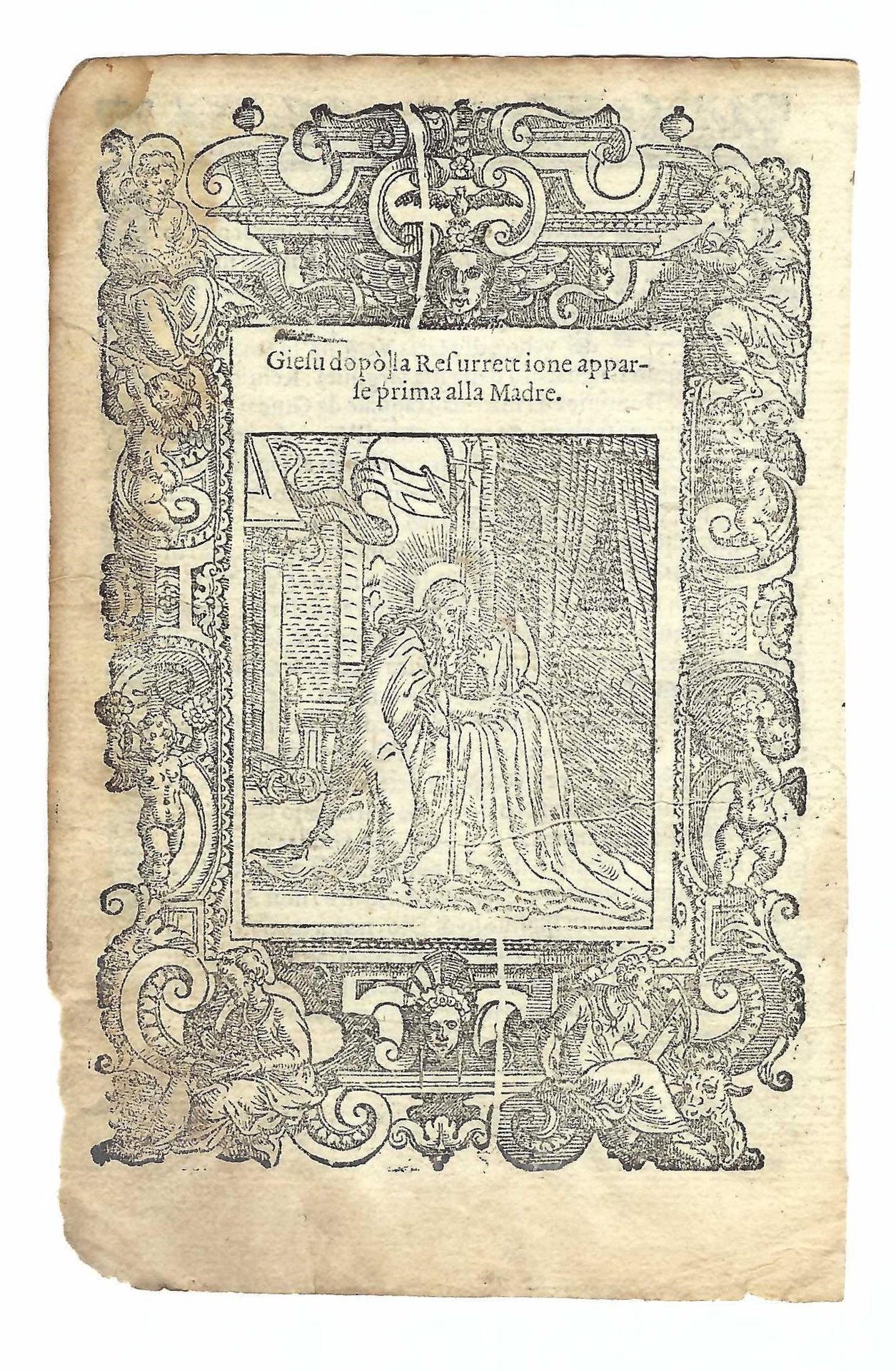 Xilografia cm. 15,7 x 10,5 il foglio, cm 13,7 x 9,4 parte incisa, bruniture ai margini, lievi mancanze al margine inferiore sinistro, margine inferiore esterno brunito e assottigliato