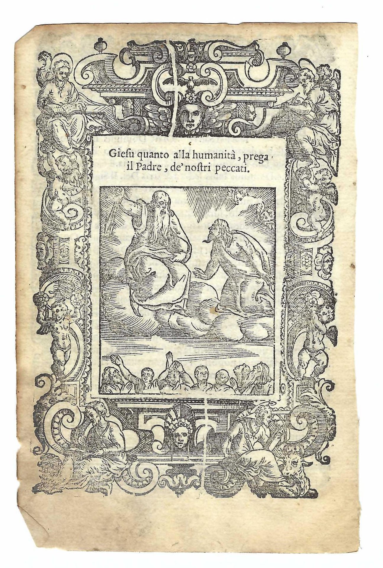 Xilografia cm. 15,7 x 10,5 il foglio, cm 13,7 x 9,4 parte incisa, bruniture ai margini, lievi mancanze al margine inferiore sinistro, margine inferiore esterno brunito e assottigliato