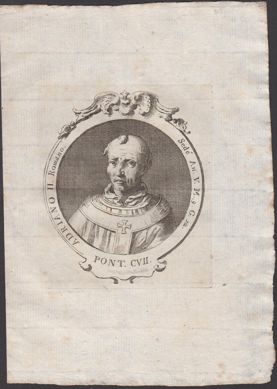 Stampa incisione Papa Adriano II Romano Pont. CVII 1775 inc. G. B. Cavalieri