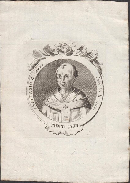 Stampa incisione Papa Anastasio III Romano Pont. CXXII 1775 inc. G. B. Cavalieri