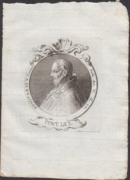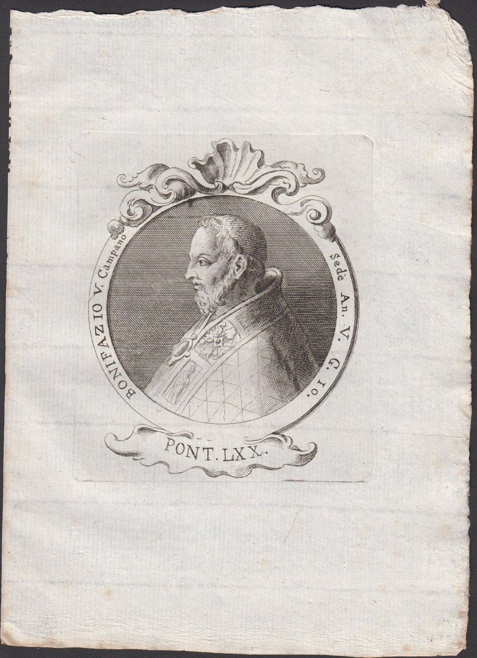Stampa incisione Papa Bonifazio V Campano Pont. LXX 1775 inc. G. B. Cavalieri