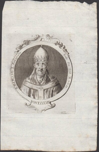 Stampa incisione Papa Damaso I Spagnolo Pont. XXXVIII 1775 inc. G. B. Cavalieri