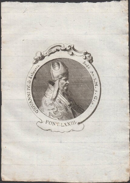 Stampa incisione Papa Giovanni IV di Dalmazia Pont. LXXIII 1775 inc. G. B. Cavalieri
