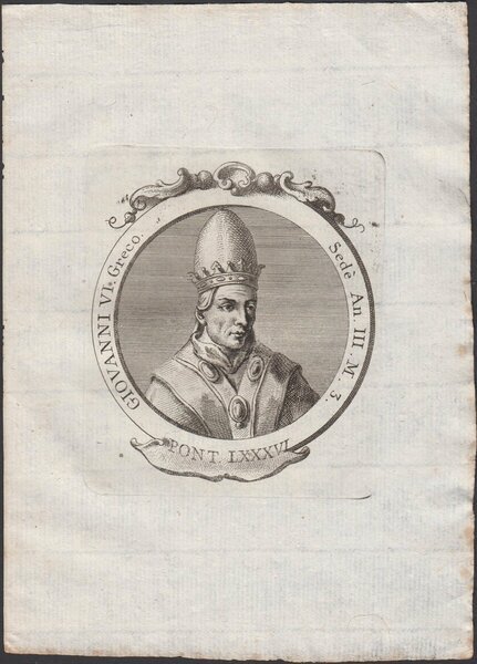 Stampa incisione Papa Giovanni VI Greco Pont. LXXXVI 1775 inc. G. B. Cavalieri