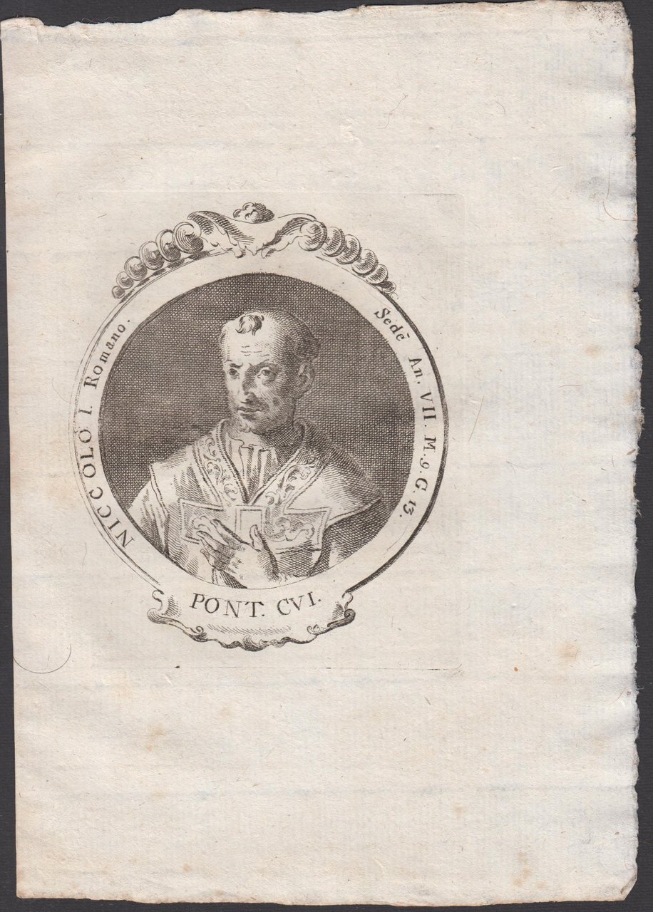 Stampa incisione Papa Niccolò I Romano Pont. CVI 1775 inc. G. B. Cavalieri
