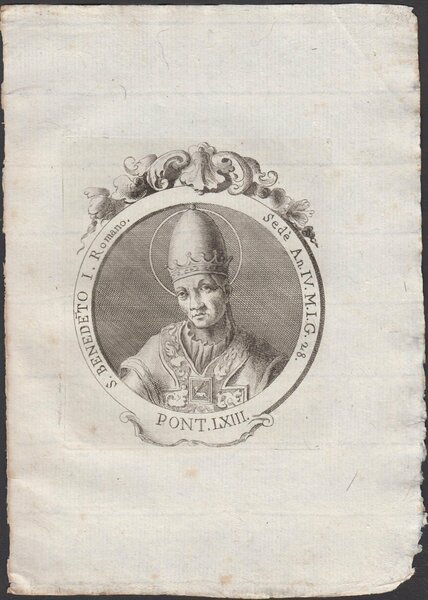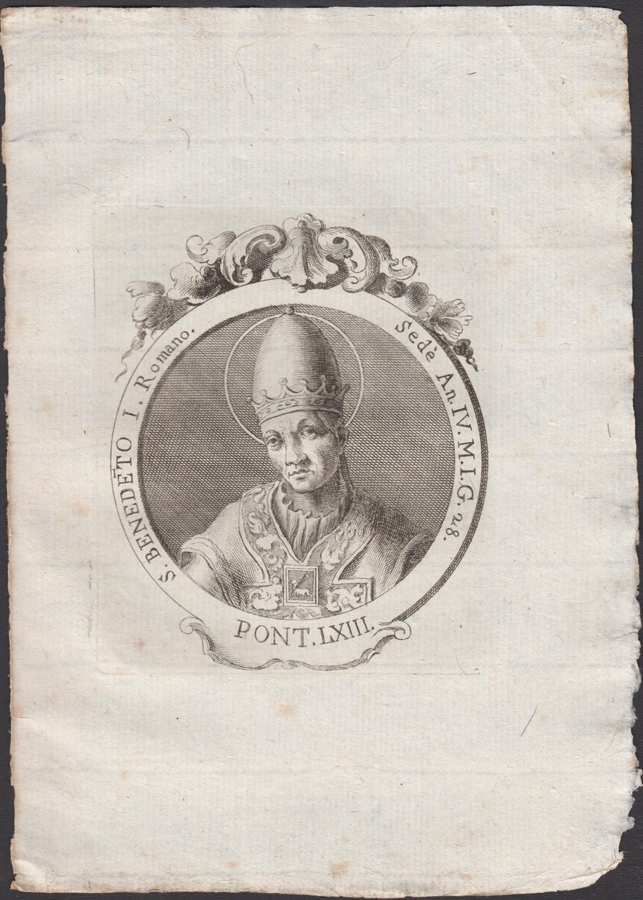 Stampa incisione Papa S. Benedetto I Romano Pont. LXIII 1775 inc. G. B. Cavalieri