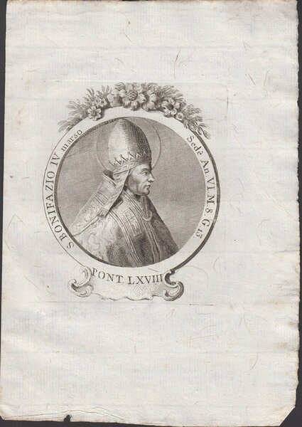Stampa incisione Papa S. Bonifazio IV Marso Pont. LXVIII 1775 inc. G. B. Cavalieri