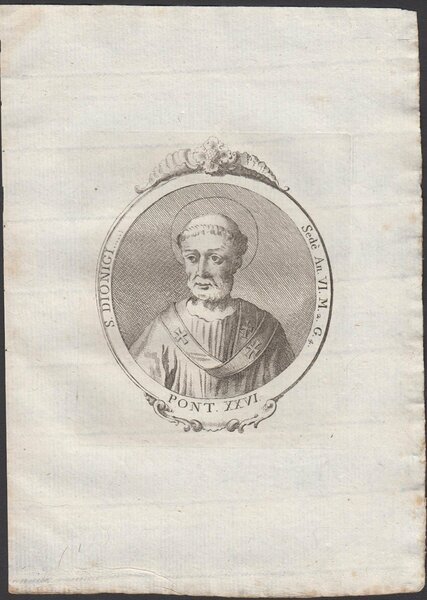 Stampa incisione Papa S. Dionigi Pont. XXVI 1775 inc. G. B. Cavalieri