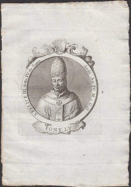 Incisione tratta da Effigies romanorum pontificum a S. Petro ad Pium VI feliciter regnantem: aeneis tabulis expressae, ordine chronologico digestae, ac in duos tomos distributae, autore Giovan Battista Cavalieri editore Remondini 1775